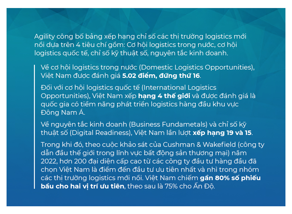 Theo báo cáo của Agility, VN đã lọt vào top 10/50 thị trường logistics mới nổi của thế giới nhờ có vị trí địa lý thuận lợi. Đây là yếu tố hấp dẫn các doanh nghiệp quốc tế khi họ đang tìm cách giảm bớt sự phụ thuộc vào thị trường Trung Quốc. Ngoài ra, sự tăng trưởng kinh tế, sản xuất và tiêu dùng trong nước, cũng như sự bùng nổ của thương mại điện tử đã mang lại những cơ hội thực sự cho logistics VN.