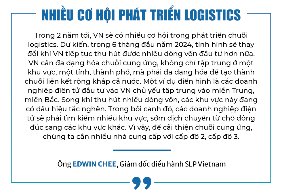 Ông đánh giá: “Việc có nhiều dự án giao thông trọng điểm, quan trọng đã được đầu tư; cảng biển, cảng sông hay mạng lưới kết nối cảng nói chung cũng được thực hiện tạo thuận lợi cho hoạt động logistics. VN có lợi thế là nằm ở trung tâm khu vực ASEAN nên càng có cơ hội để phát triển ngành logistics. Tuy nhiên, ngành này vẫn còn một số yếu điểm. Đó là chi phí vẫn còn cao so với mức trung bình của khu vực. Một số dịch vụ còn thực hiện thủ công, chuyển đổi số trong lĩnh vực này còn chậm nên chưa đáp ứng được nhu cầu của DN. Kế đến là nguồn nhân lực cho logistics số nói riêng hay ngành này nói chung vẫn còn hạn chế. Phải khắc phục được những yếu điểm trên thì ngành logistics VN mới tăng tốc được”.